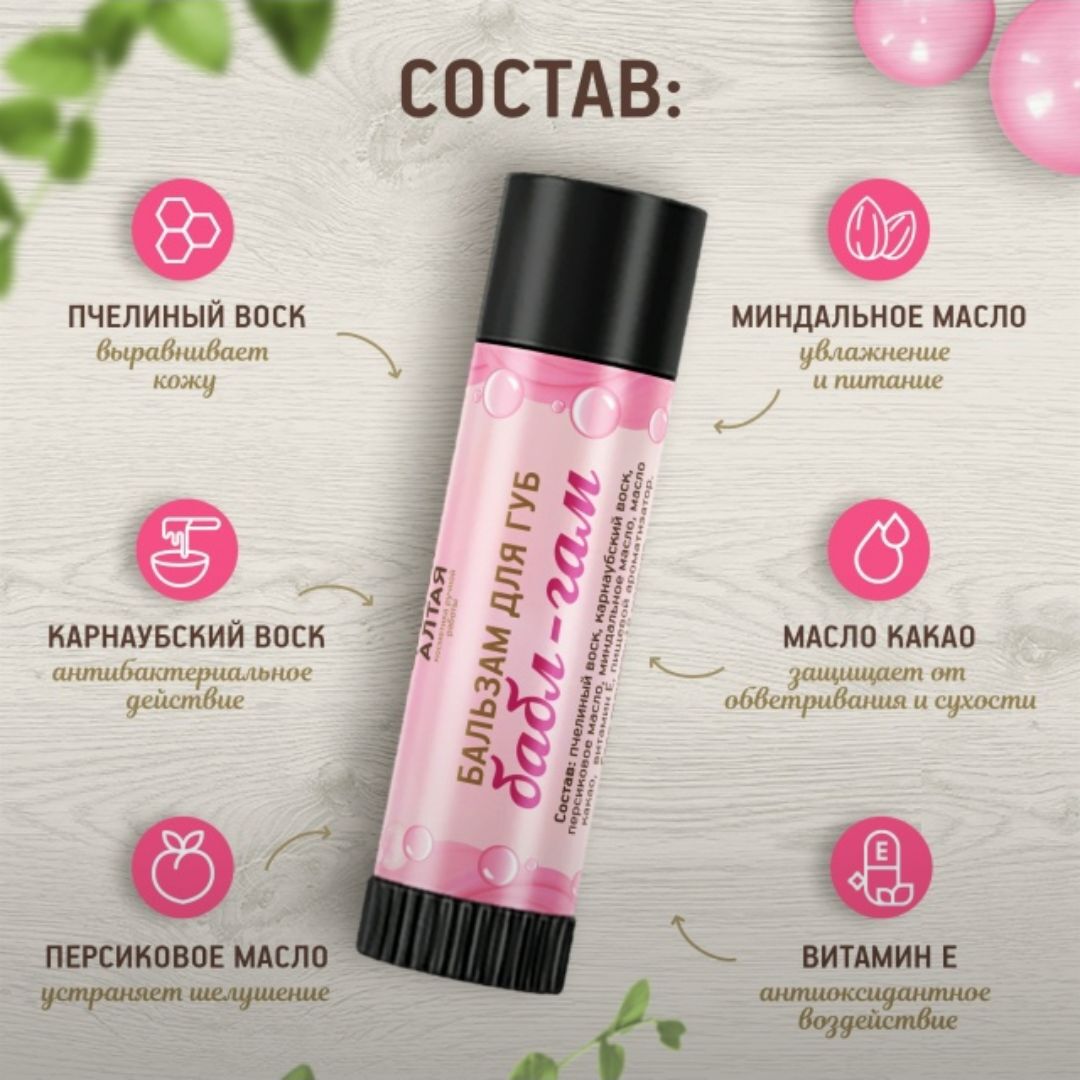 💄 Бальзам для губ Бабл Гам ✨ВОССТАНАВЛИВАЕТ ПОВРЕЖДЕННЫЕ И ОБВЕТРЕННЫЕ ГУБЫ ✨ЗАЖИВЛЯЕТ РАНКИ И ТРЕЩИНКИ НА ГУБАХ ✨УБИРАЕТ СуХОСТЬ И ШЕЛУШЕНИЕ ✨ПРИДАЕТ ЕСТЕСТВЕННОЕ СИЯНИЕ ГУБАМ ✨ГЛУБОКО УВЛАЖНЯЕТ И ПИТАЕТ ГУБЫ ✨ЗАЩИЩАЕТ OTBETPA И МОРОЗА ✨СНИМАЕТ ЗУД ПРИ ГЕРПЕСЁ И УКУСАХ НАСЕКОМЫХ ✨Состав: пчелиный воск, карнаубский воск, персиковое масло, миндальное масло, масло какао, витамин E, ароматизатор пищевой.