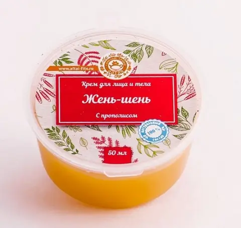 🌸Жень-шень с прополисом (крем), 50 мл ✨Основа крема — вытяжка из корня женьшеня. Высокоэффективное омолаживающее средство. Ускоряет обмен веществ в коже, заряжает её энергией, отлично тонизирует. Оказывает регенерирующее действие. Способствует разглаживанию морщин. Женьшень обладает противовоспалительным действием. 🦋Применение: нанести мягкими массажными движениями на 20-30 минут, остатки удалить сухой салфеткой. 🔔Состав: пчелиный воск, масло оливы, прополис, вытяжка из корня женьшеня.