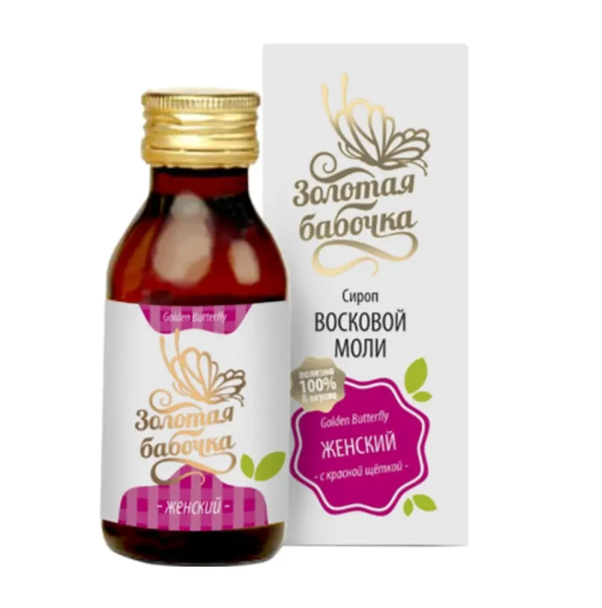 💕Золотая бабочка «Женский»: здоровье, леди – это главное! ✨Сироп восковой моли для женщин может стать настоящим открытием. Настойка личинок этой мелкой бабочки – буквально сокровищница полезнейших веществ, которые помогут вашему организму настроится на эффективную работу. Если конкретно, элементы, содержащиеся в личинках огнёвки повышают сопротивляемость микробам и низким температурам, параллельно оптимизируя работу кровеносной системы. ✨Мы сделали этот сироп восковой моли еще более эксклюзивным для женщин, добавив в него сбор травок, которые традиционно используют в Алтайском крае для решения гинекологических проблем, характерных для разных возрастов (нормализация менструального цикла, снижение климактерических симптомов и пр.). 🔔Состав Настой восковой моли, настой красной щетки, сахарный сироп, кислота аскорбиновая