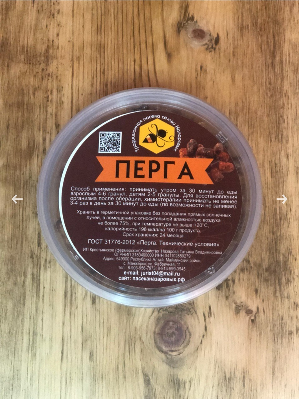 🦋Перга пчелиная Перга — это самый полезный продукт пчеловодства, который на 1/3 состоит из белка, а также содержит огромное количество витаминов, аминокислот и минералов. Широко используется как в традиционной, так и в народной медицинах. 💕Перга́ (пчелиный хлеб) — пыльца растений, собранная медоносной пчелой, уложенная в ячейки сот, залитая мёдом и законсервированная образующейся молочной кислотой. Спустя 3 месяца ферментации молочной кислотой образовывается перга. 💕Процесс ферментации аналогичен тому, как это происходит в молочных продуктах, йогуртах. Он позволяет сохранить и обогатить пергу полезными питательными веществами, и делает её самым полезным продуктом пчеловодства. 💕В дальнейшем пчёлы кормят пергой своих детенышей. Отсюда и название — пчелиный хлеб. Пчелиная перга – уникальный по своей полезности и целебным свойствам продукт. 🦋Перга, примерно на 1/3 от общего состава, содержит белок. Поэтому она очень популярна среди спортсменов, т.к. помогает набрать мышечную массу, а также быстро восстановиться после изнурительных физических нагрузок. Помимо большого количества белка, перга содержит огромное количество витаминов, аминокислот и минералов. 🦋Благодаря такому богатому составу, перга успешно используется как в традиционной, так и в народной медицинах. Для качественного продукта характерны темно-желтый или коричневый оттенок, медово-пыльцевой запах, кисло-сладкий, немного горьковатый вкус. 🔔Состав Перга пчелиная. 100% натуральный продукт. Не содержит химических добавок, красителей и консервантов 💎Список основных показаний для применения перги: 🪄При заболеваниях сердечно-сосудистой системы — нормализует давление, укрепляет стенки сосудов, благодаря содержанию калия. 🪄При заболеваниях крови — помогает избавиться от анемии (малокровия), благодаря большому содержанию легко усваиваемого железа 🪄При заболеваниях мочеполовой системы- применяется при лечении бесплодия у женщин. 🪄Мужчинам рекомендуется применять этот продукт в сочетании с медом при импотенции и для профилактики заболеваний простаты. 🪄При нарушениях нервной системы — помогает нормализовать функционирование нервной системы, избавиться от стрессов и улучшить работу памяти, благодаря наличию магния в составе. 🪄Перга пчелиная является хорошим антидепрессантом и релаксантом 🪄При заболеваниях глаз. Перга содержит большое количество каротиноидов (в 20 раз больше, чем в самом известном источнике каротина – моркови). В человеческом организме каротиноиды трансформируются в витамин А, который улучшает зрение. 🪄При простудных заболеваниях — помогает при лечении бронхитов, ангин, тонзиллитов, фарингитов и пневмоний. Перга — отличный иммуномодулятор. 🪄При заболеваниях ЖКТ — помогает без лекарств нормализовать функции кишечника. Назначается при гастритах, изжоге, колитах, дисбактериозе, при диарее, хронических запорах, язвенной болезни, при плохом аппетите и болезнях печени. Перга помогает лучше усваивать из пищи полезные вещества. 💣Способ применения перги пчелиной Профилактическая дозировка продукта составляет от 5 до 10 г ежедневно на протяжении месяца. Затем делается перерыв на 2 недели, после чего при необходимости курс можно возобновить. Точные дозировки и продолжительность терапевтического лечения зависят от конкрет