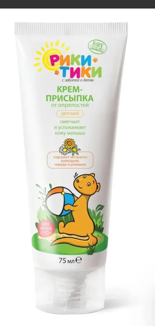 🥰 Рики Тики Крем-присыпка детский 🦋Крем-присыпка предназначен для ухода за кожей малыша с первых дней жизни. Крем имеет приятную консистенцию, легко наносится и быстро распределяется, долго сохраняется на коже, предотвращает и устраняет раздражения, покраснения и опрелости. 🪄Активные компоненты; ✨Д-пантенол стимулирует регенерацию кожи, питает и смягчает ее. ✨Комплекс натуральных экстрактов календулы, ромашки, череды, тысячелистника, акации,оказывает успокаивающее и витаминизирующее действия на кожу. ✨Оксид цинка оказывает подсушивающее и успокаивающее действия в складочках нежной детской кожи, обладает защитным действием. 🪄Способ применения: Нанести на чистую сухую кожу малыша при каждой смене подгузника. Подходит для частого применения. При возникновении воспалений и опрелостей крем можно наносить так часто, как это необходимо.