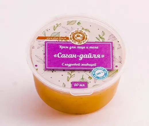 ✨Саган-дайля с кедровой живицей (крем), 50 мл 🦋Снимает отечность вокруг глаз, тонизирует кожу, разглаживает мимические морщины, улучшает регенерацию тканей. ⚡️Применение: нанестина кожулегкими массажными движениями на 20-30 минут, остатки крема удалить сухой салфеткой. 🔔Состав: Пчелиный воск, масло оливы, экстракт саган-дайля, живица (смола кедра), витамин Е.